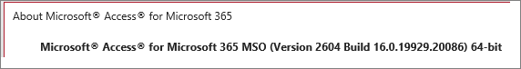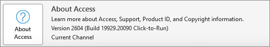 For example, the new Zooming feature is available in 365 Current Channel (Preview) version 2604 19929.20090 but not in the same version and build in 365 Current Channel. The feature is also not available in any update channels, versions or builds of Access 2024. Much of the Office version info is available next to the About Access button in backstage view, though the bitness and Office license info are both omitted.